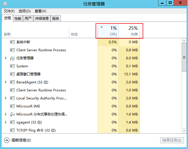 说明: 您可单击 CPU 或内存,以升序/降序对进程进行排序。
