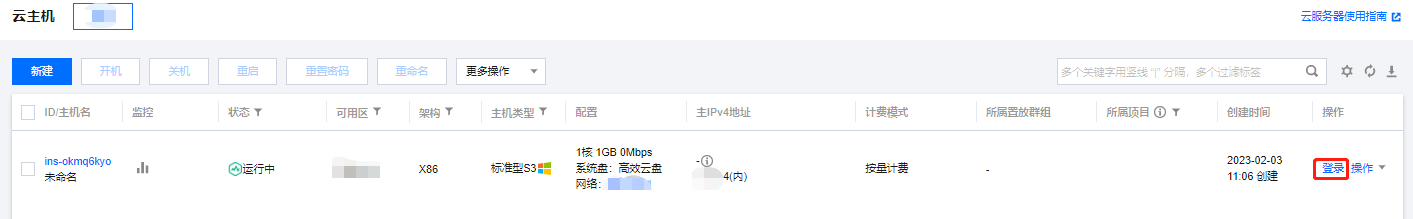 - 在实例列表中,选择需要登录的 Windows 云服务器,单击【登录】。